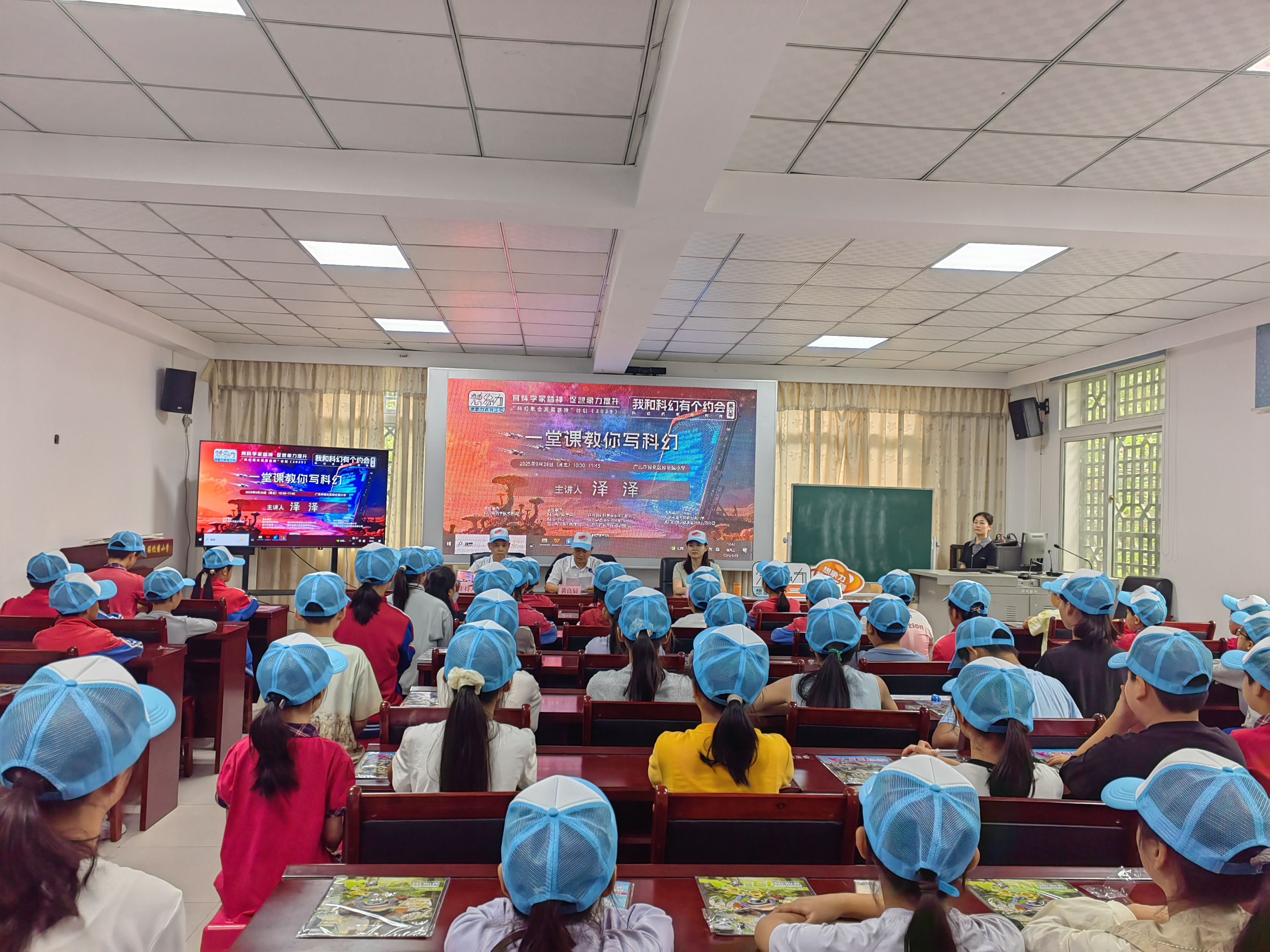 与此同时,学校礼堂内,省科学技术协会“科幻融合发展扶持”计划——“我和科幻有个约会”主题活动,以“育科学家精神,促想象力提升”为核心,为小学生们带来一堂充满趣味的科幻创作启蒙课。科幻世界想象力课程编辑、四川省作家协会会员、四川科普作家协会会员泽泽老师以生动、直观的故事,结合经典科幻作品与前沿科技,引导学生突破思维边界。通过“生活化引导-逻辑化建构-创意化表达”三阶教学法,系统拆解科幻创作核心要素。并开展互动提问启发学生,现场学生踊跃发言,提出充满想象力的设想。