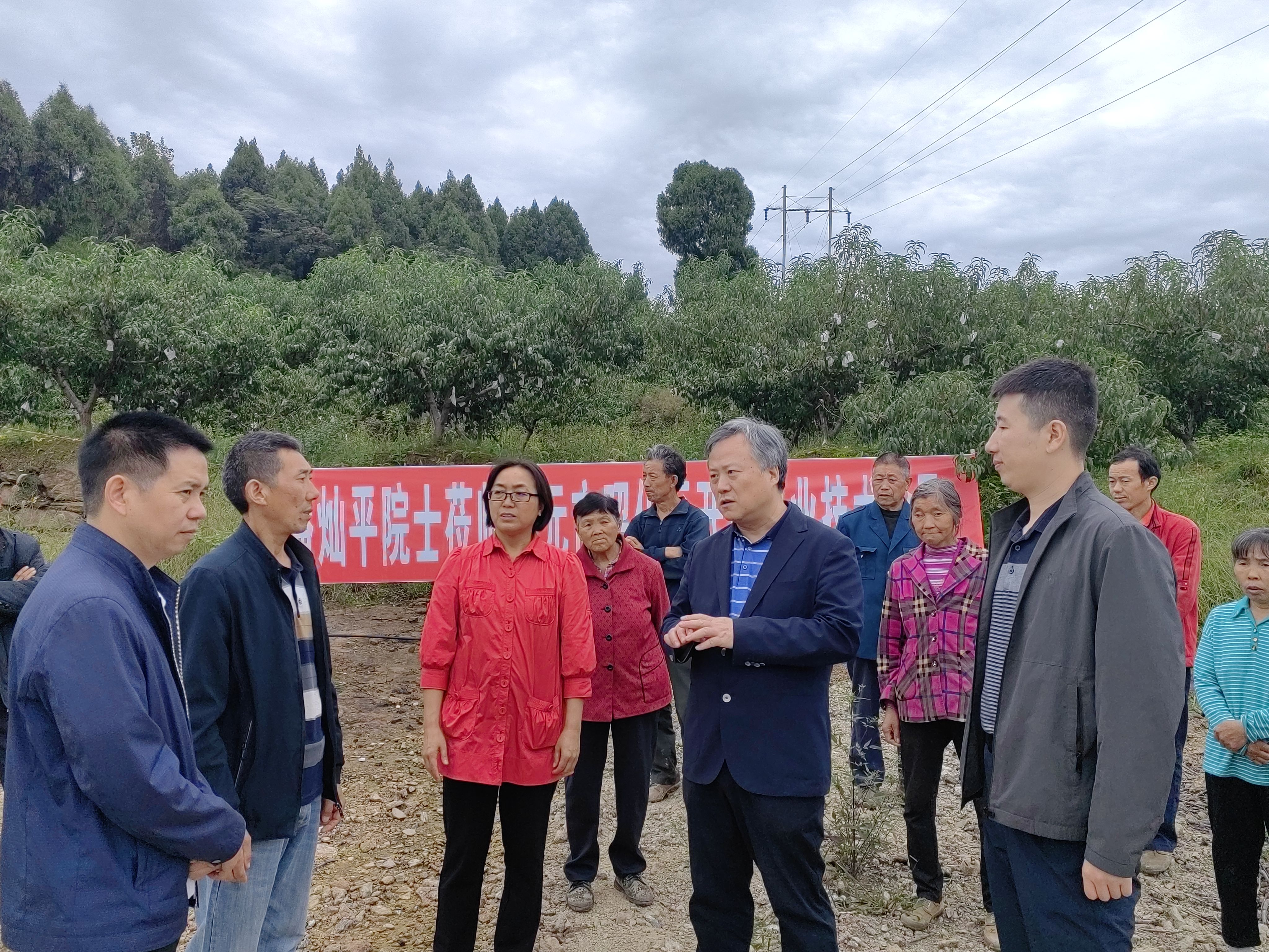 随后,潘灿平院士一行前往射箭镇潼梓村,对该村的桃园种植基地进行了实地调研。他详细了解桃树的品种、栽培管理模式以及果实品质等情况。围绕富硒桃产业的发展,潘院士从土壤硒元素活化、桃树营养调控、果实品质提升等传授了实用技术。同时,他还积极为当地牵线搭桥,推介在桃种植技术、精深加工及市场销售方面具有优势的相关企业资源,为桃产业的全链条发展赋能。