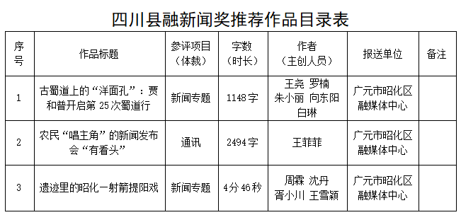 四川省新闻工作者协会组织开展的2025年度四川县融新闻奖暨2025年度四川新闻奖(县融类)评选工作现已开始,经过中心严格筛选、审核,决定报送以下3件作品参评,现予以公示,举报电话为0839-6280182。