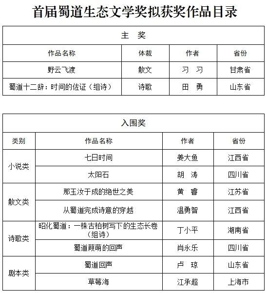 附件:首届蜀道生态文学奖拟获奖作品目录