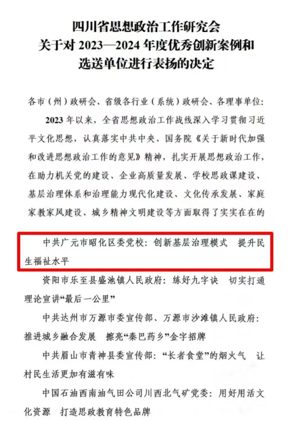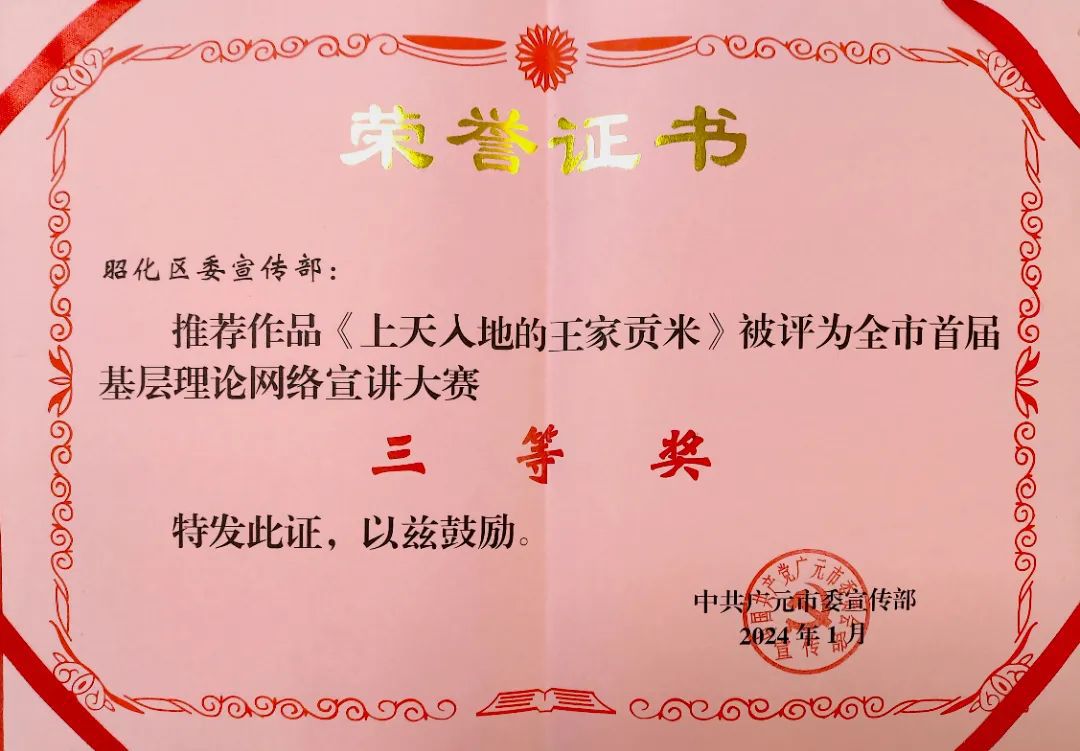 深化理论阐释,不断拓展习近平新时代中国特色社会主义思想研究的广度和深度,理论阐释出新出彩。组织撰写理论调研文章30余篇,《培植内生动力走好高质量发展之路》等24篇理论文章在国家省市平台刊发。推选申报社科研究成果9项,《广元市基层矛盾纠纷多元化解路径研究—以昭化区“12345”模式为例》《高标准建设中国西部(广元)绿色家居产业城的路径研究》等4项市级课题被批准立项。《昭化区天雄村党建引领乡村振兴“两手抓,两手硬”》入选新华网2024乡村振兴实践案例,《创新基层治理模式 提升民生福祉水平--广元市昭化区基层治理“一核四治”的启示》获四川省思想政治工作年度优秀创新案例。《县级党校“全链”提升干部教育培训质效的路径研究——以昭化区为例》获评全省科研优秀成果三等奖 。《广元市昭化区法治护航重大建设项目的探索与实践》等3篇理论文章获全市理论征文优秀理论文章奖项。区社科联在全市社科工作会议上交流发言。