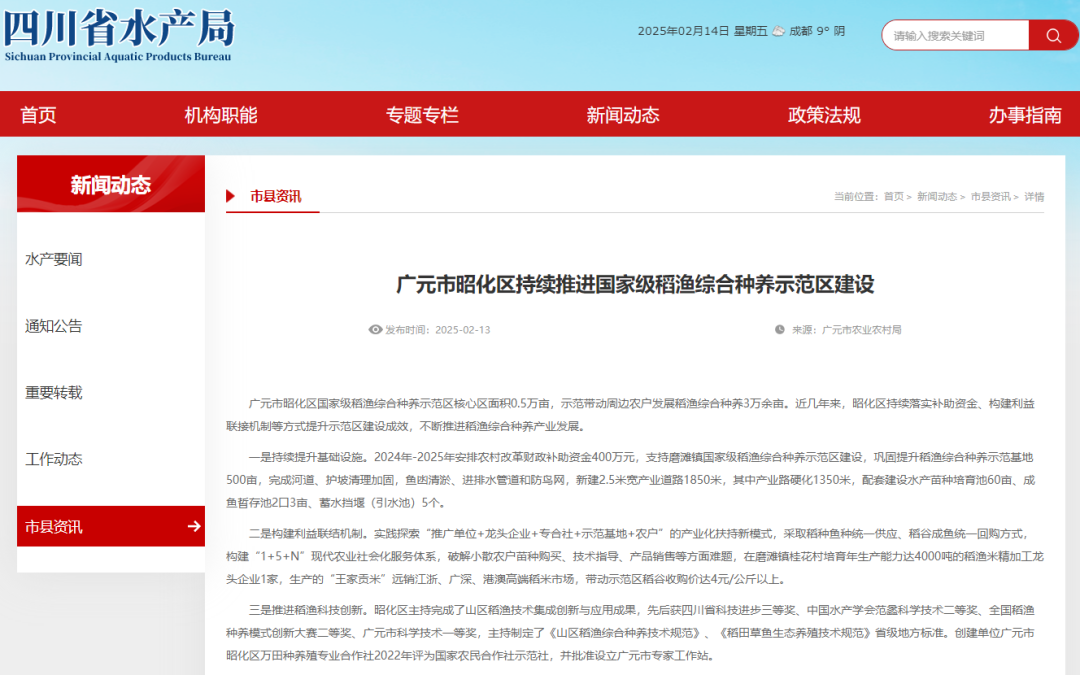 广元市昭化区国家级稻渔综合种养示范区核心区面积0.5万亩,示范带动周边农户发展稻渔综合种养3万余亩。近几年来,昭化区持续落实补助资金、构建利益联接机制等方式提升示范区建设成效,不断推进稻渔综合种养产业发展。