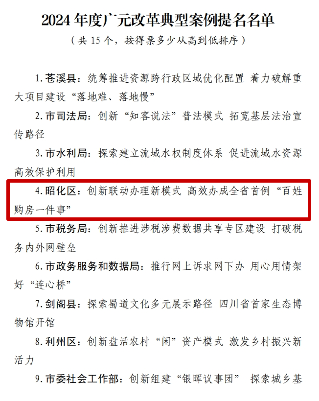 近年来,昭化区坚持“最多跑一次”改革思路,针对百姓购房审批服务环节多、流程繁琐等问题实际,创新推出“百姓购房一件事”联动工作机制,全面梳理优化审批流程,进一步压减办理时限,高效办成全省首例“百姓购房一件事”,实现百姓购房一体化办理、多元化服务。截至目前,申请材料由49份压减至12份,办理环节由10个压减至5个,审批时限由23个工作日压减至9个工作日,同比下降76%、50%、61%。