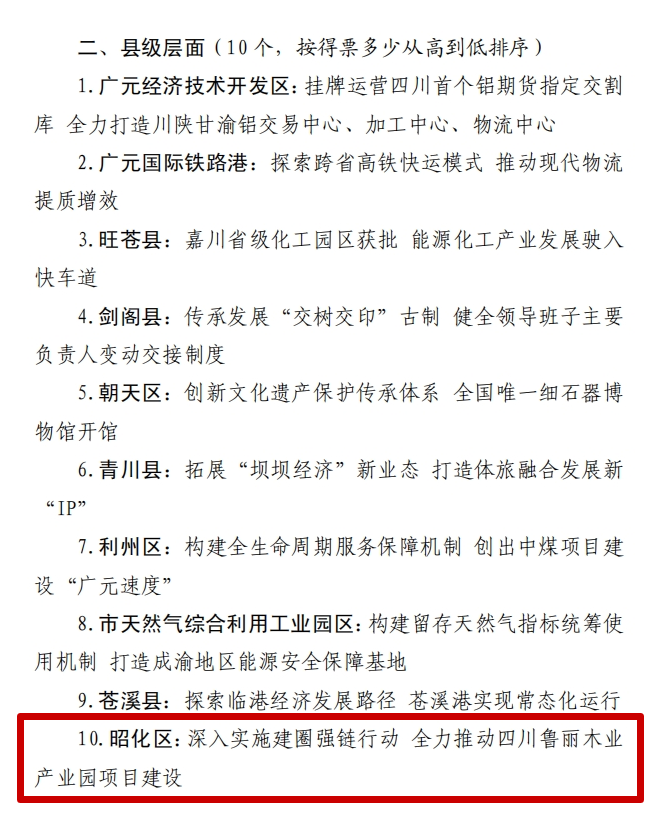 2024年7月26日,昭化区成功签约总投资64亿元鲁丽木业产业园项目,该项目是广元市目前招引能级最高、规模最大、辐射带动最强的制造业项目,鲁丽集团成为全市首个完成重大产业项目“揭榜攻坚”的“揭榜人”。该项目从签约到开工仅用时36天,特别是在土地报征上,创造了大体量土地报征当月上交正式资料、次月省政府批复的“鲁丽速度”。目前,该项目整体土地场平工程已完成100%,生物质热电项目、年产25万方超薄密度板项目和年产80万立方米定向刨花板项目正加速建设,项目将于2026年全面投产,预计建成投产后综合年产值超过72亿元,年缴纳税收3亿元以上,带动就业2000余人。