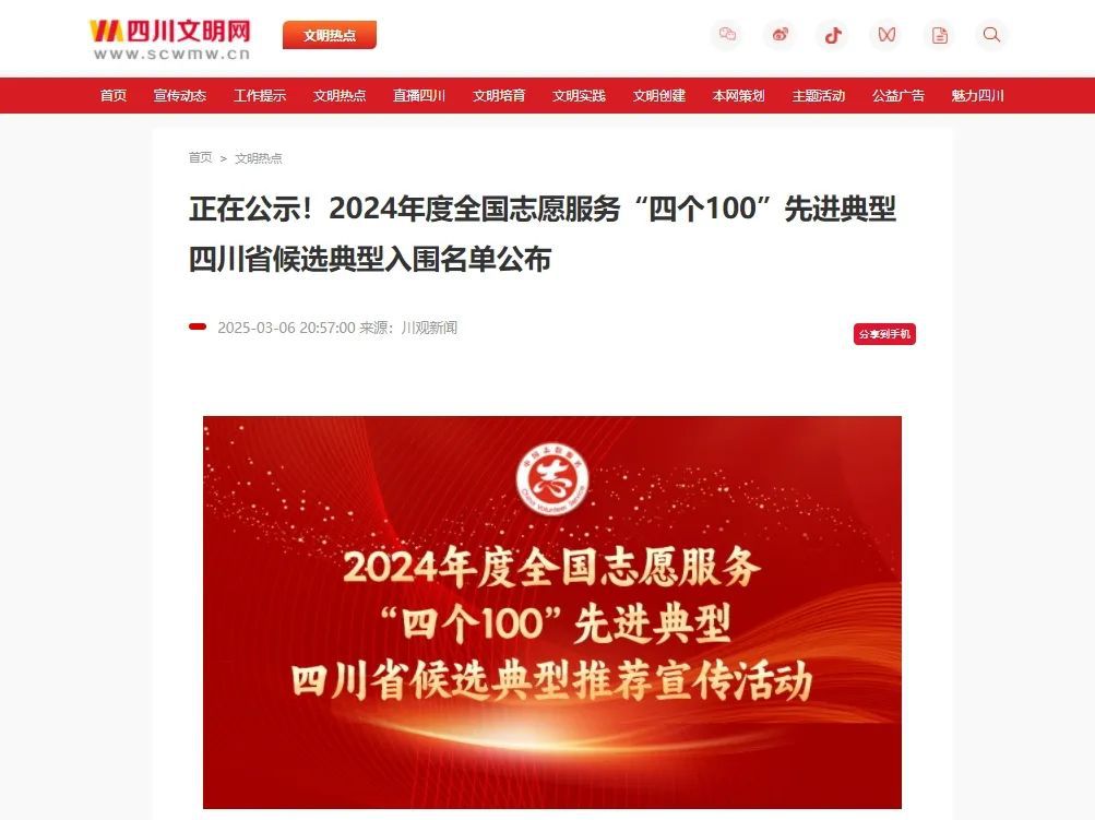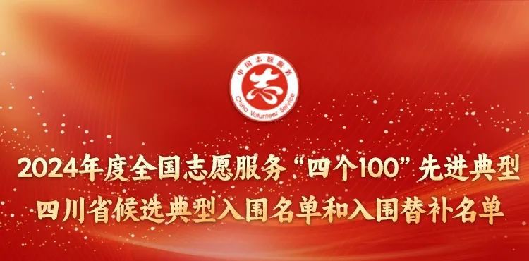 根据中共四川省委社会工作部等19部门《关于推荐宣传2024年度全国志愿服务“四个100”先进典型四川省候选典型的通知》部署安排,在各地和省直有关部门择优推荐的基础上,经过集中展示、集中评分、集中评议等环节,组委会审议提出了2024年度全国志愿服务“四个100”先进典型四川省候选典型入围名单40个、入围替补名单12个。