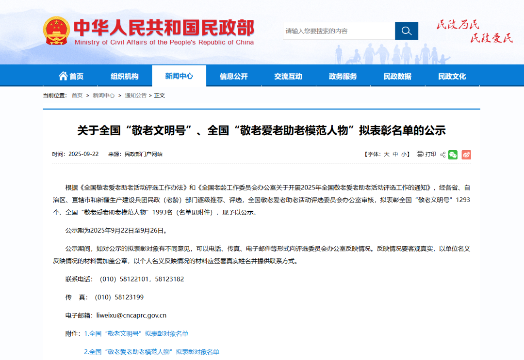 公布了关于全国“敬老文明号”