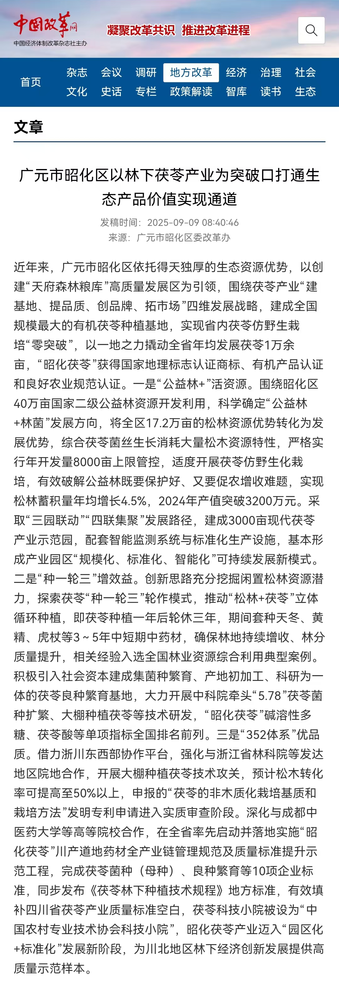 近年来,广元市昭化区依托得天独厚的生态资源优势,以创建“天府森林粮库”高质量发展区为引领,围绕茯苓产业“建基地、提品质、创品牌、拓市场”四维发展战略,建成全国规模最大的有机茯苓种植基地,实现省内茯苓仿野生栽培“零突破”,以一地之力撬动全省年均发展茯苓1万余亩,“昭化茯苓”获得国家地理标志认证商标、有机产品认证和良好农业规范认证。一是“公益林+”活资源。围绕昭化区40万亩国家二级公益林资源开发利用,科学确定“公益林+林菌”发展方向,将全区17.2万亩的松林资源优势转化为发展优势,综合茯苓菌丝生长消耗大量松木资源特性,严格实行年开发量8000亩上限管控,适度开展茯苓仿野生化栽培,有效破解公益林既要保护好、又要促农增收难题,实现松林蓄积量年均增长4.5%,2024年产值突破3200万元。采取“三园联动”“四联集聚”发展路径,建成3000亩现代茯苓产业示范园,配套智能监测系统与标准化生产设施,基本形成产业园区“规模化、标准化、智能化”可持续发展新模式。二是“种一轮三”增效益。创新思路充分挖掘闲置松林资源潜力,探索茯苓“种一轮三”轮作模式,推动“松林+茯苓”立体循环种植,即茯苓种植一年后轮休三年,期间套种天冬、黄精、虎杖等3~5年中短期中药材,确保林地持续增收、林分质量提升,相关经验入选全国林业资源综合利用典型案例。积极引入社会资本建成集菌种繁育、产地初加工、科研为一体的茯苓良种繁育基地,大力开展中科院牵头“5.78”茯苓菌种扩繁、大棚种植茯苓等技术研发,“昭化茯苓”碱溶性多糖、茯苓酸等单项指标全国排名前列。三是“352体系”优品质。借力浙川东西部协作平台,强化与浙江省林科院等发达地区院地合作,开展大棚种植茯苓技术攻关,预计松木转化率可提高至50%以上,申报的“茯苓的非木质化栽培基质和栽培方法”发明专利申请进入实质审查阶段。深化与成都中医药大学等高等院校合作,在全省率先启动并落地实施“昭化茯苓”川产道地药材全产业链管理规范及质量标准提升示范工程,完成茯苓菌种(母种)、良种繁育等10项企业标准,同步发布《茯苓林下种植技术规程》地方标准,有效填补四川省茯苓产业质量标准空白,茯苓科技小院被设为“中国农村专业技术协会科技小院”,昭化茯苓产业迈入“园区化+标准化”发展新阶段,为川北地区林下经济创新发展提供高质量示范样本。