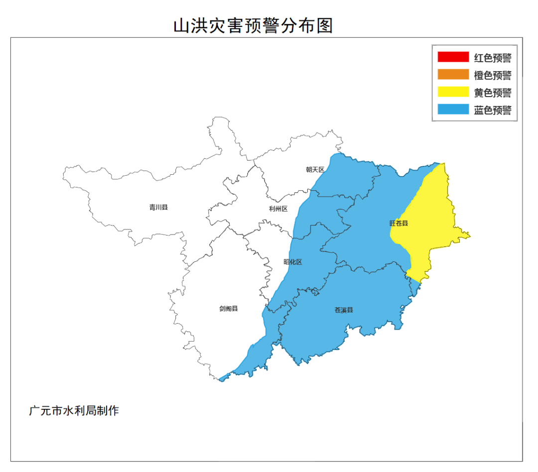 苍溪县全境,剑阁县木马镇、鹤龄镇、樵店乡、杨村镇、羊岭镇、香沉镇、公兴镇、涂山镇、金仙镇、演圣镇、元山镇,利州区大石镇、荣山镇,朝天区两河口镇、曾家镇、李家镇、麻柳乡、临溪乡,昭化区元坝镇、卫子镇、王家镇、柏林沟镇、太公镇、虎跳镇、清水镇,旺苍县除黄色预警区域外的其余乡镇可能发生山洪灾害(蓝色)。