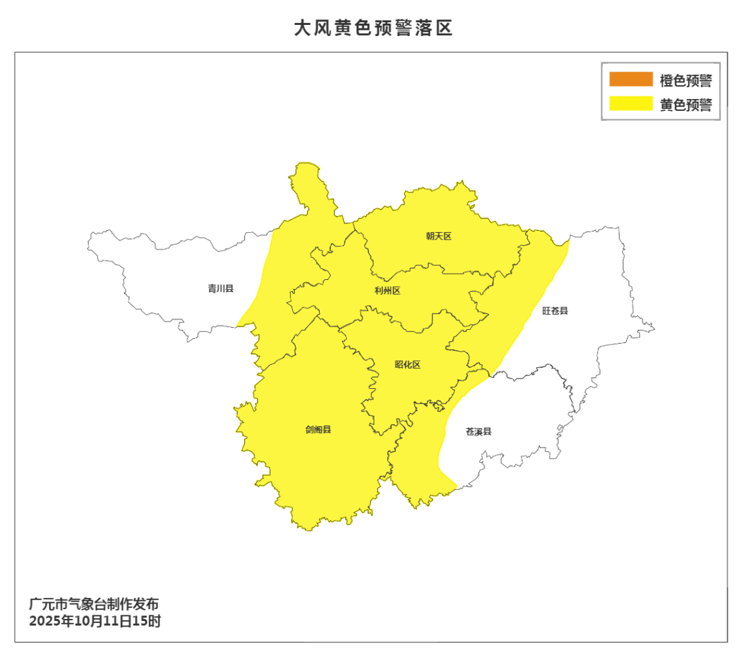 预计10月11日20时到12日20时,我市利州区、昭化区、朝天区、剑阁县、青川县东部、苍溪县西部和旺苍县西部有5~7级偏北风,山口河谷地带风力可达8级或以上。请注意加固围板、棚架、广告牌等搭建物,保证行路、行车安全,刮风时不要在广告牌、临时搭建物等下面逗留。