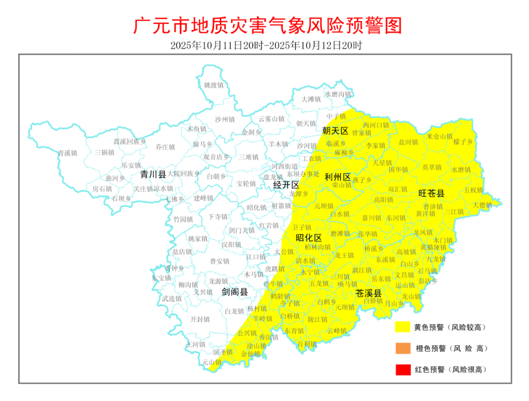 根据气象部门天气预报情况,结合我市地质环境条件,经会商研判,10月11日20时-10月12日20时,广元市地质灾害气象风险预警预报结果如下: