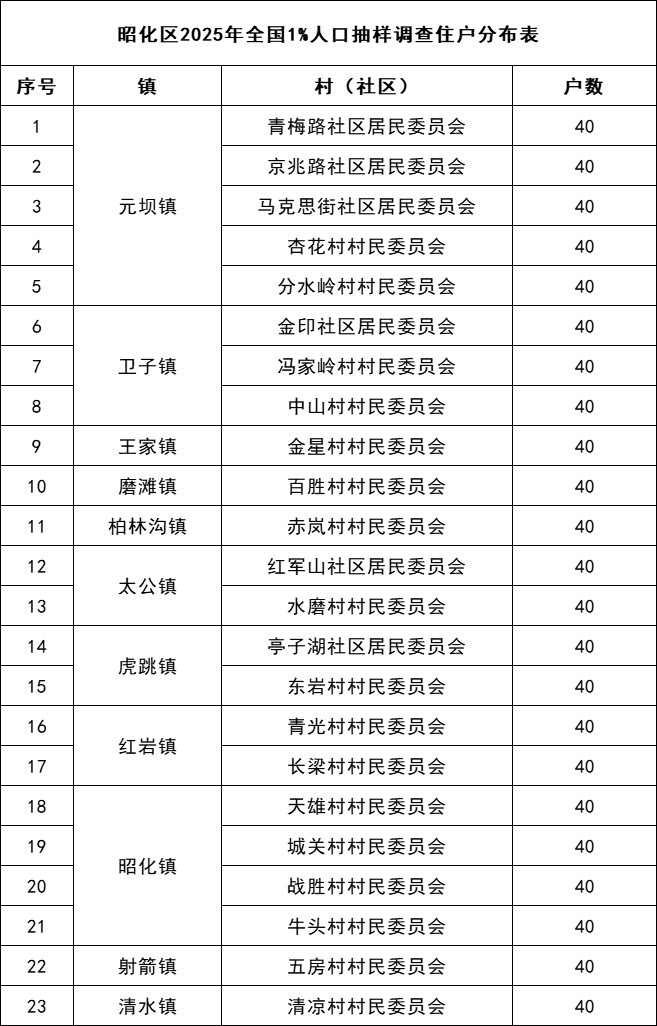 (五)调查任务:昭化区2025年全国1%人口抽样调查涉及全区11个镇(青牛镇除外)的23个村委会(社区)的23个调查小区,每个调查小区抽样40户,全区共计住户920户。