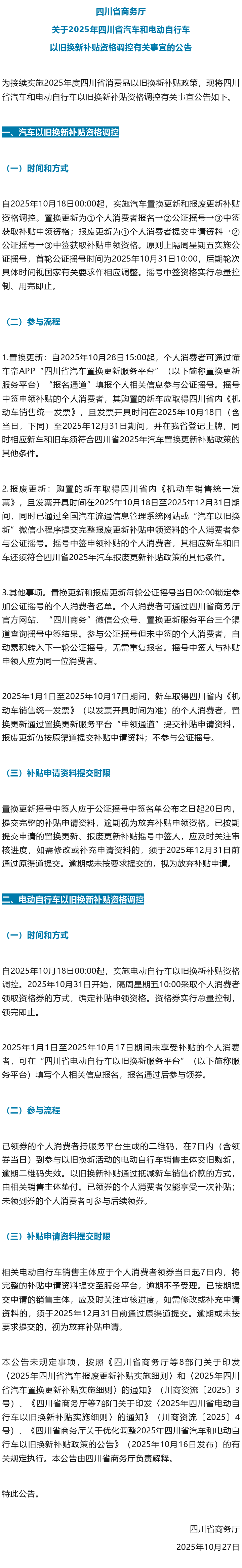 10月27日晚,四川省商务厅发布公告称,自2025年10月18日00:00起,实施汽车置换更新和报废更新补贴资格调控,实施公证摇号申领。电动自行车则采取个人消费者领取资格券的方式,确定补贴申领资格。