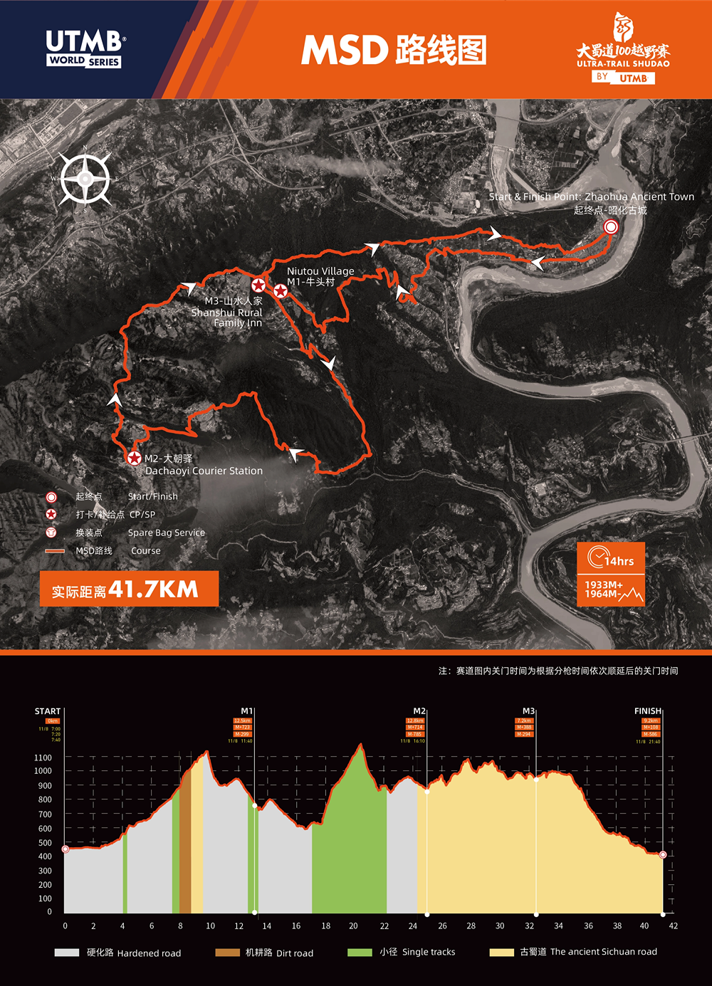 2. 山地越野赛41.7公里组(MSD)个人赛:昭化古城—战胜村—牛头村—五堆村—剑昭路—大朝驿—王家山—天雄关—昭化古城太守街—昭化古城游客中心