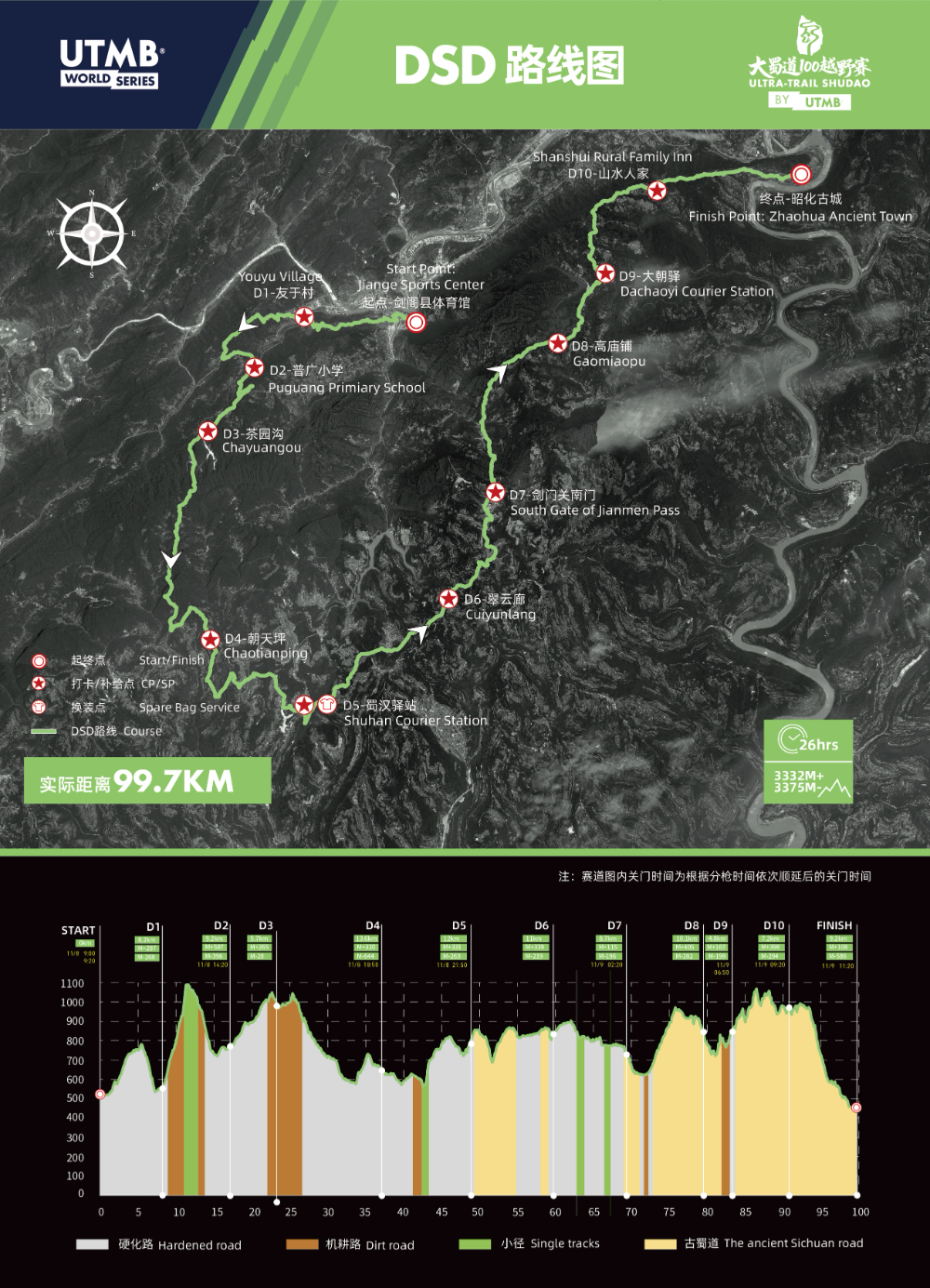 1. 山地越野赛99.7公里组(DSD)个人赛:剑阁县体育馆—高庙铺—贾家沟—叉儿岩—铁门子—大朝驿—王家桥—桥沟子—周家湾—新繁村—上新铺—下新铺—牛头村—王家沟—五堆村—法梁寺—刘家山—范家沟—陶家寺—何家沟—郭家沟—天雄关—战胜村—罗家岩—战胜坝—虎牢关—昭化古城游客中心