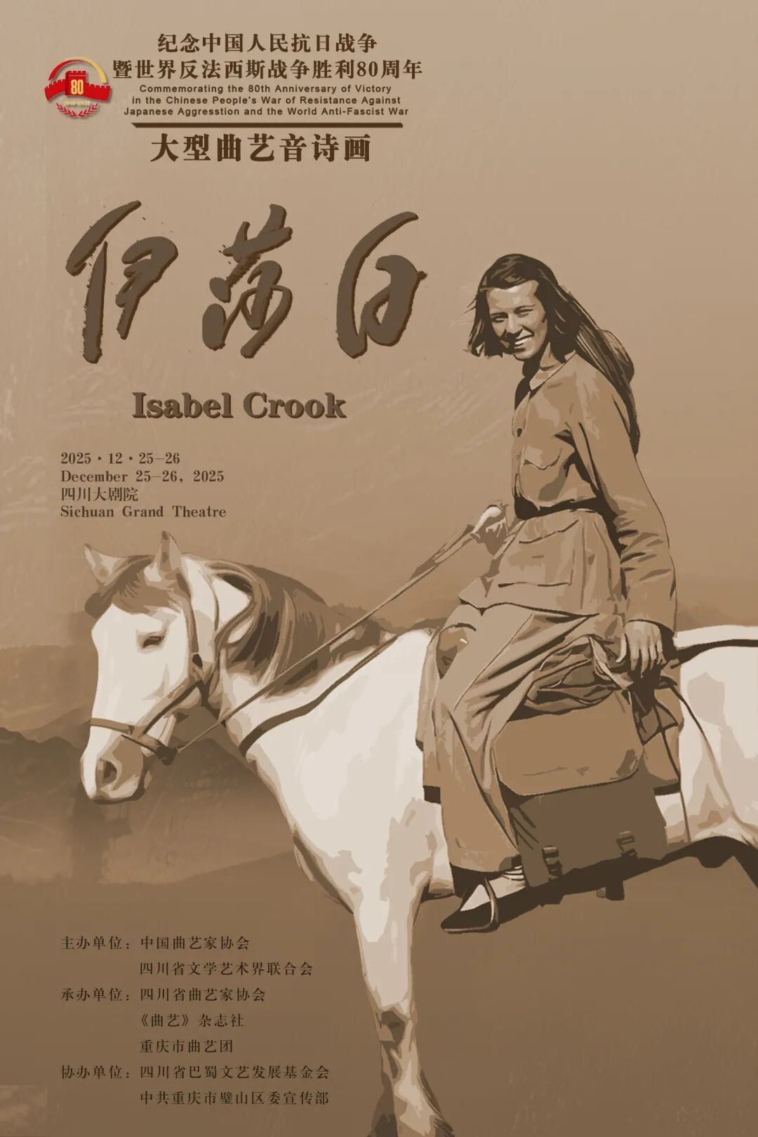 为纪念中国人民抗日战争暨世界反法西斯战争胜利80周年,12月25日—26日,大型原创曲艺音诗画《伊莎白》在成都演出。主人公伊莎白·柯鲁克女士,是生于成都的加拿大人,中华人民共和国“友谊勋章”获得者,在108年的生命轨迹中,她亲历了中国从积弱到强盛的沧桑巨变,用毕生实践诠释对中国的赤诚深情。用人民喜闻乐见的形式弘扬这份伟大国际主义精神,是对国际友人最好的纪念,也是曲艺创新的突破性实践。