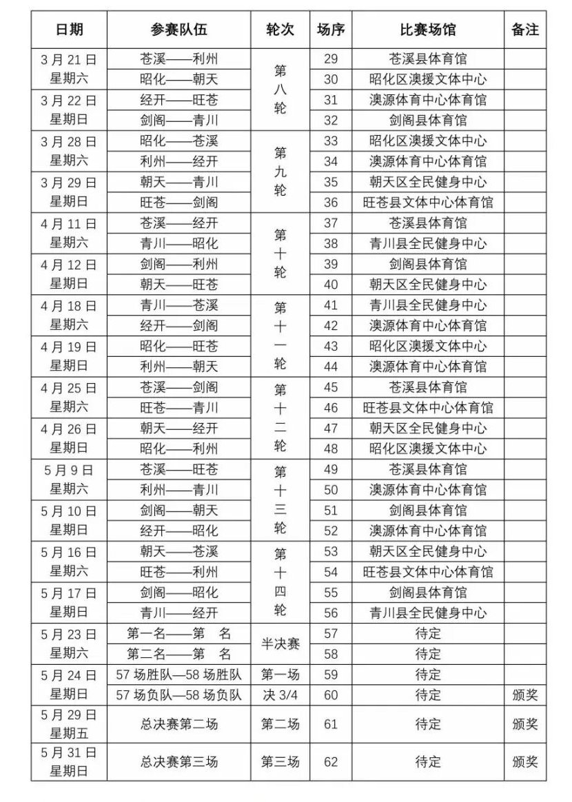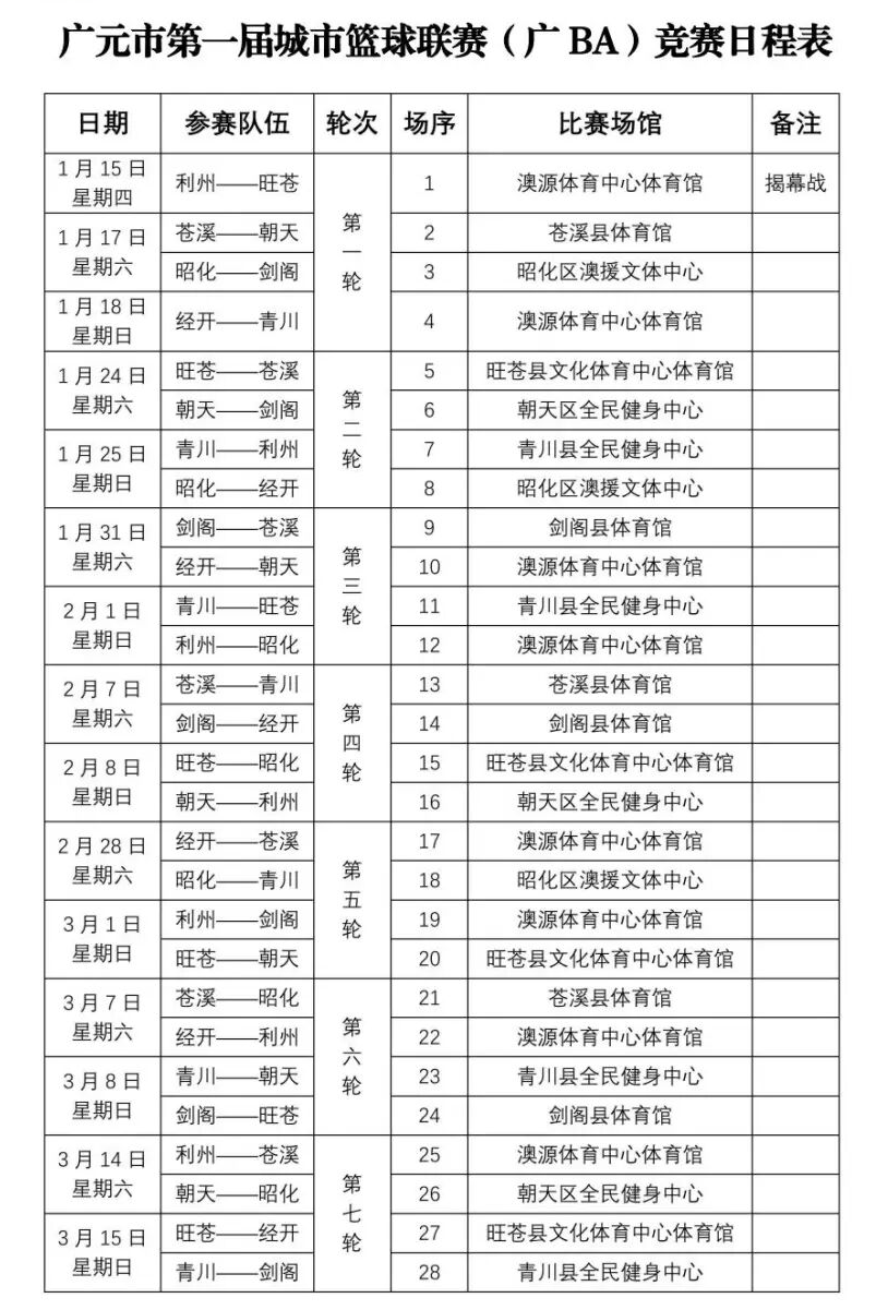 按照赛程,本次比赛揭幕战将于1月15日(星期四)在广元澳源体育中心体育馆鸣锣开赛,届时将由利州队和旺苍队带来首场对决。