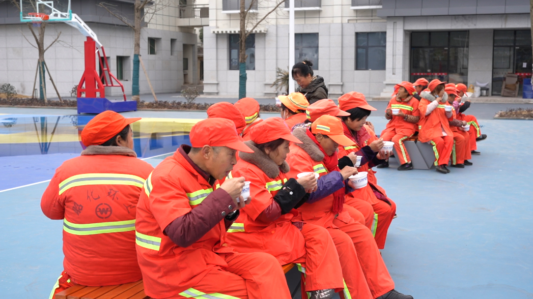 环卫工人捧着温热的粥碗围坐在一起,边喝边唠家常,软糯香甜的滋味在舌尖化开,一股暖意顺着喉咙蔓延至心底,瞬间驱散了冬日寒凉,话语间满是对新年的憧憬。