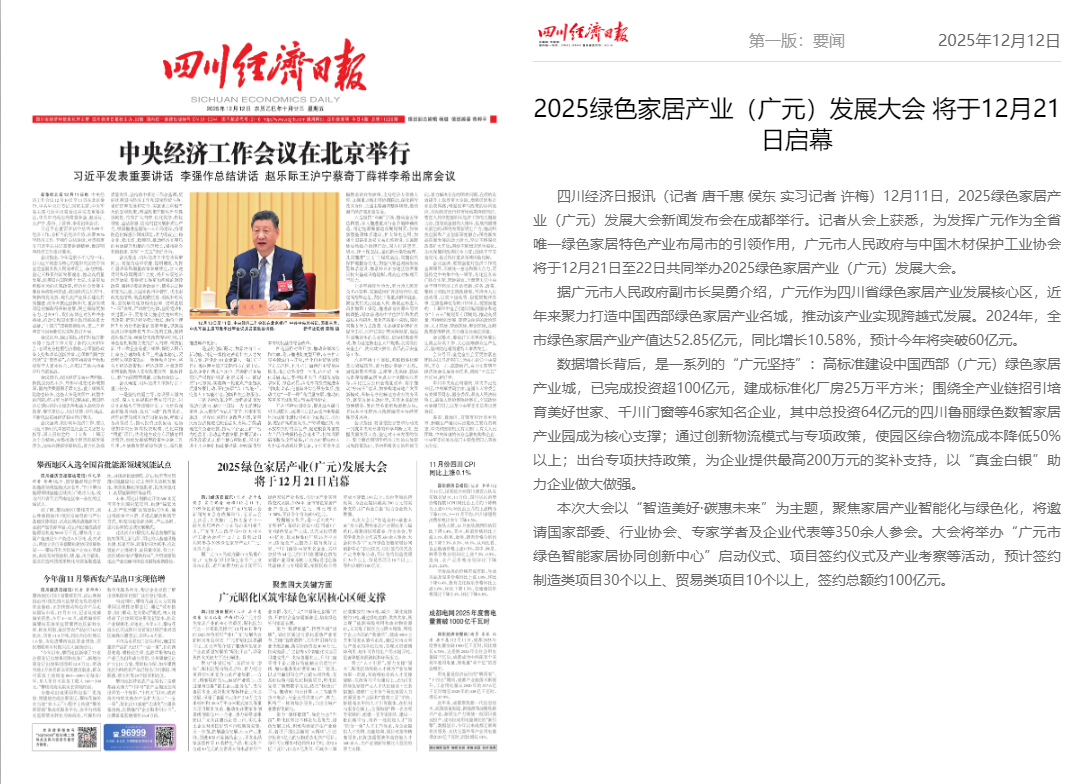 2025年12月12日【四川经济日报(头版)】2025绿色家居产业(广元)发展大会 将于12月21日启幕