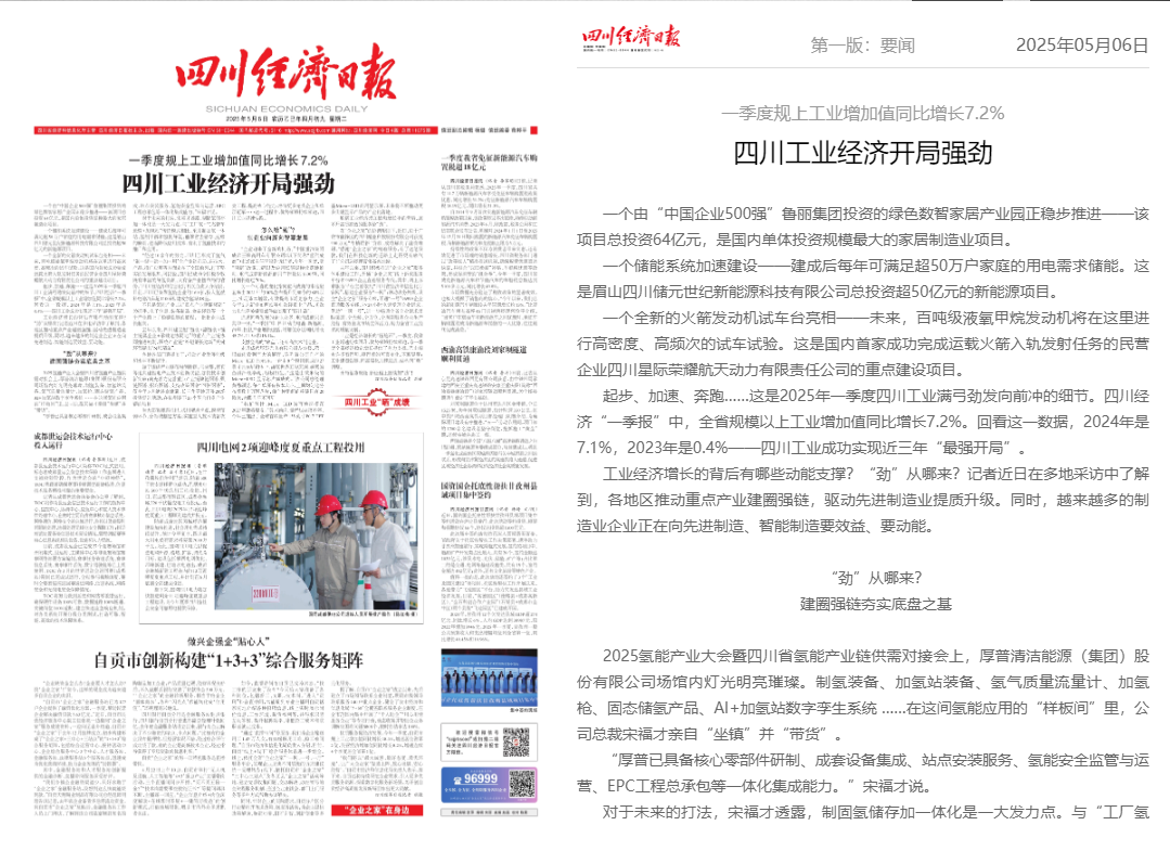 2025年5月6日【四川经济日报(头版头条)】一季度规上工业增加值同比增长7.2% 四川工业经济开局强劲