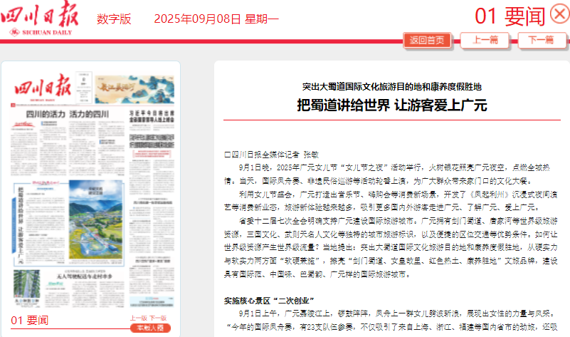 2025年9月8日【四川日报(头版)】突出大蜀道国际文化旅游目的地和康养度假胜地 把蜀道讲给世界 让游客爱上广元