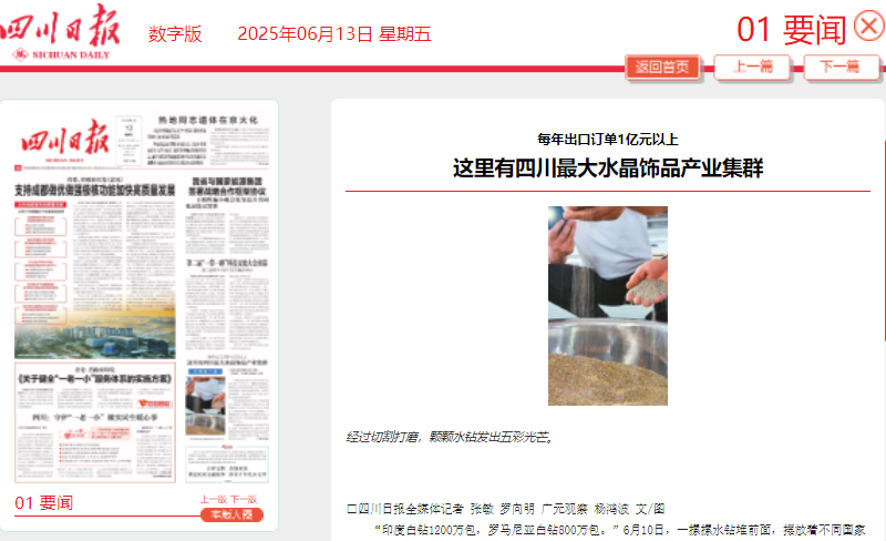 2025年6月13日【四川日报(头版)】每年出口订单1亿元以上 这里有四川最大水晶饰品产业集群