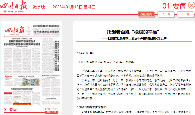 2025年1月15日【四川日报(头版)】托起老百姓“稳稳的幸福”——四川在推动高质量发展中保障和改善民生纪事