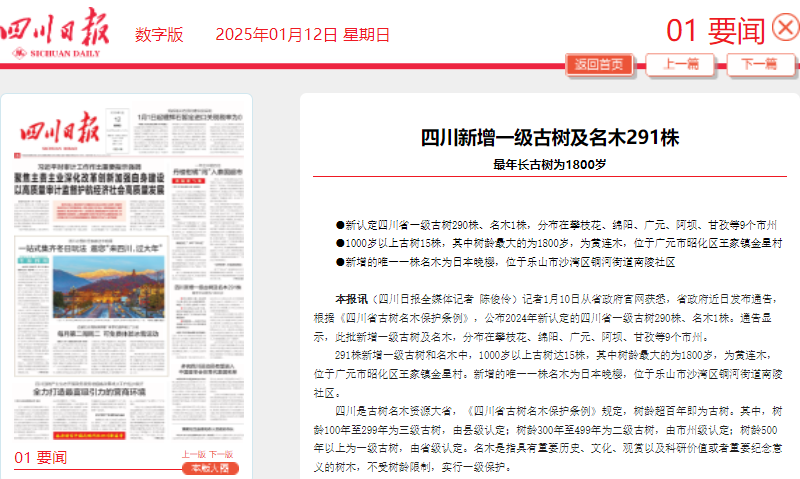 2025年1月12日【四川日报(头版)】四川新增一级古树及名木291株 最年长古树为1800岁