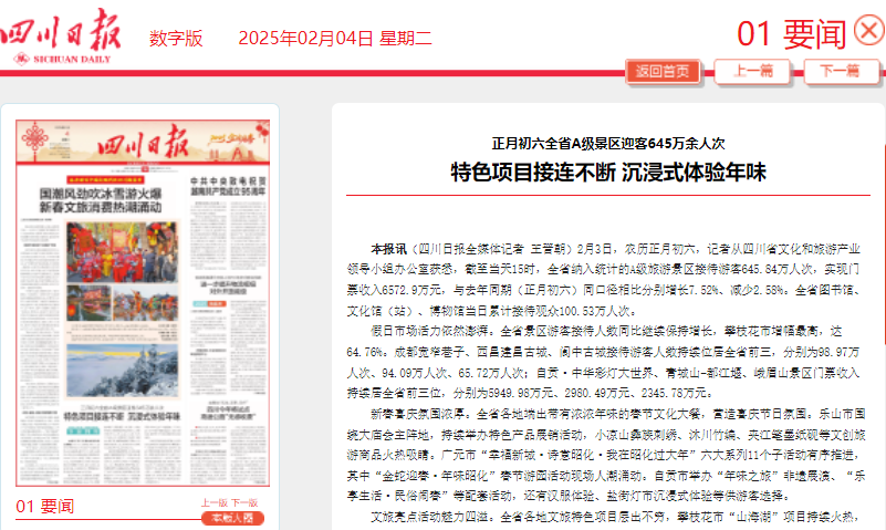 2025年2月4日【四川日报(头版)】正月初六全省A级景区迎客645万余人次 特色项目接连不断 沉浸式体验年味