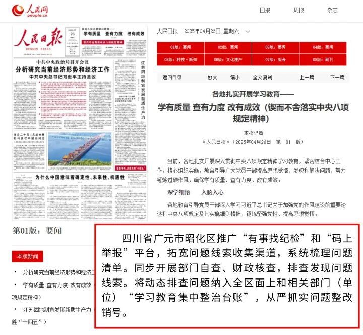 2025年4月26日【人民日报(头版)】各地扎实开展学习教育——学有质量 查有力度 改有成效(锲而不舍落实中央八项规定精神)