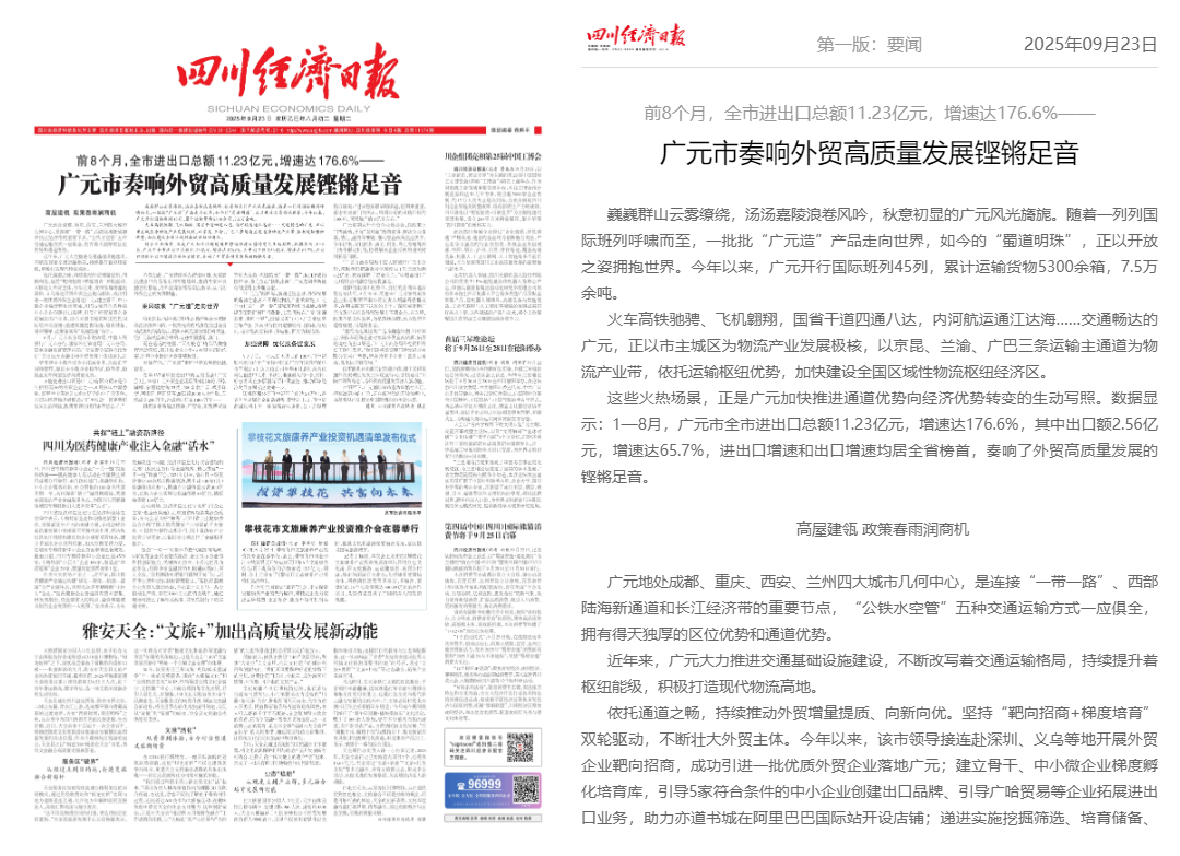 2025年9月23日【四川经济日报(头版头条)】前8个月,全市进出口总额11.23亿元,增速达176.6%——广元市奏响外贸高质量发展铿锵足音