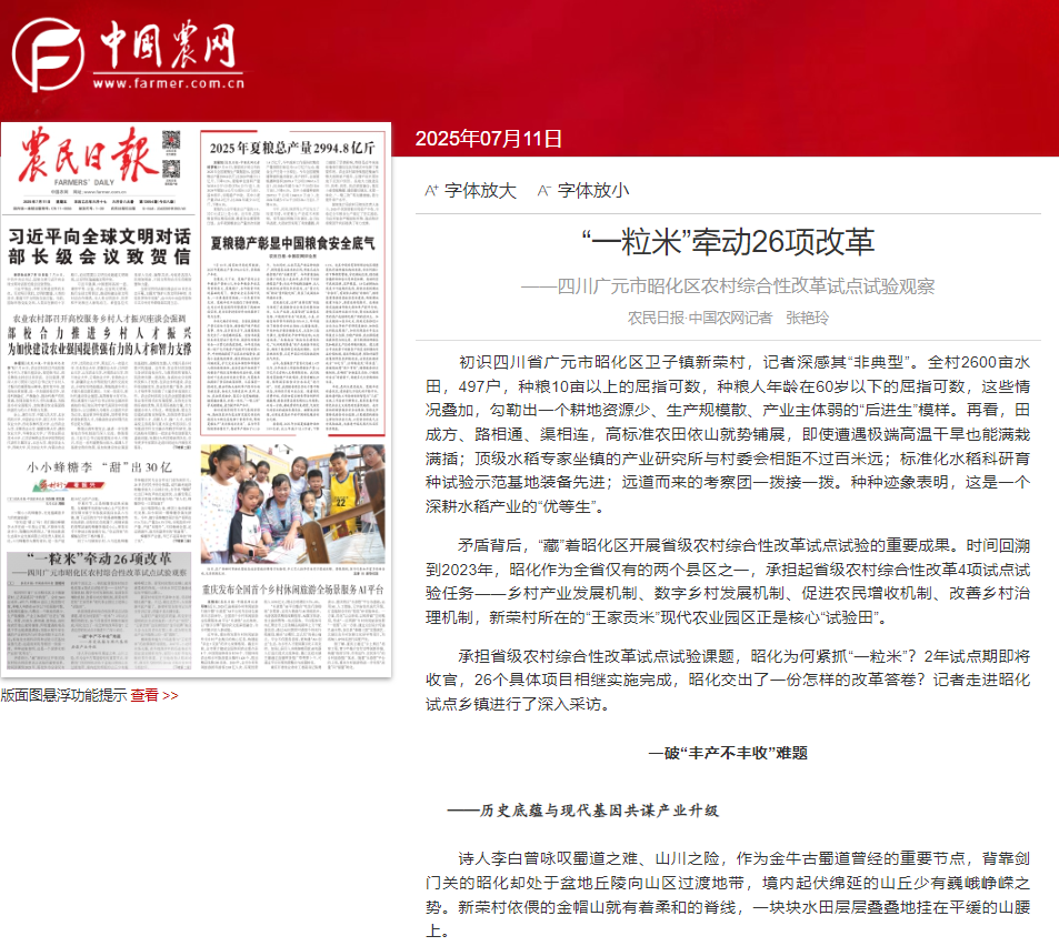 2025年7月11日【农民日报(头版)】“一粒米”牵动26项改革——四川广元市昭化区农村综合性改革试点试验观察