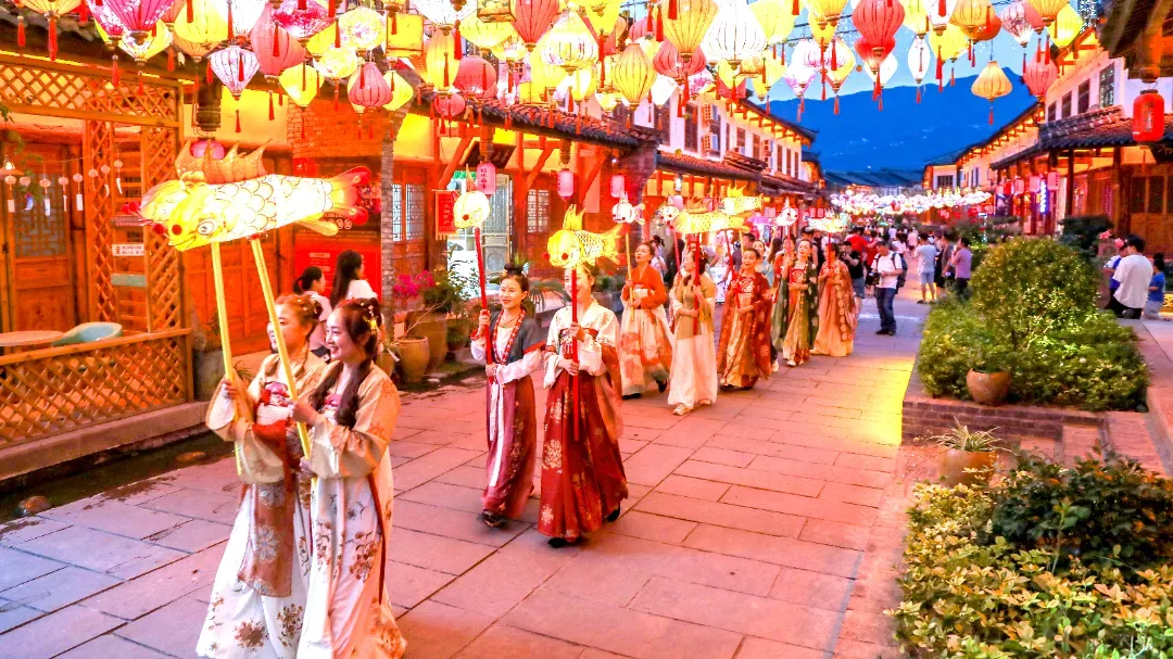 国风、福袋、鱼灯······一盏盏、一串串红灯高悬,顺着街道望去,在夜色中勾勒出昭化最动人的轮廓。