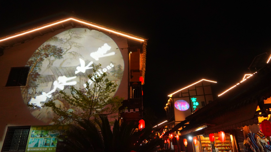 沿街的红灯笼一串串、一排排次第亮起,随风轻晃,灯影在古墙黛瓦间流转,雅致轮廓尽显。