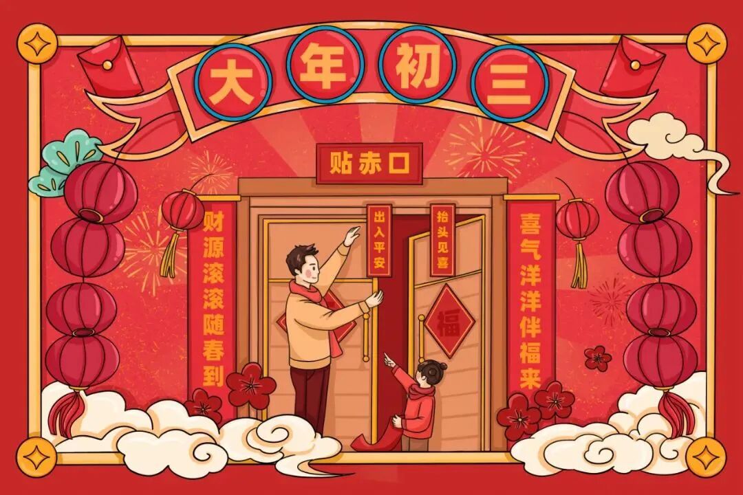 大年初三这天,一早还要贴“赤口”,一般是用约长七八寸、宽一寸的红纸条,上面写上一些出入平安的吉利话,一般贴在前门和后门的门顶上,另外有张是放在前门和后门的门顶上,另外有张是放在初一初一积攒下来的垃圾上面,最后挑出去倒掉。
