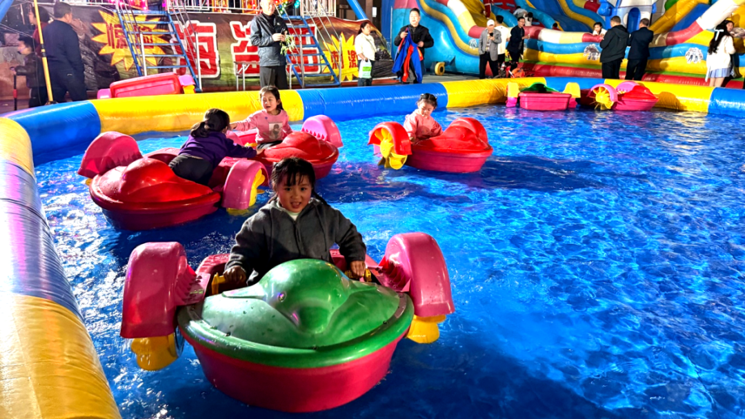 除了舌尖美味与特色好物,集市更是孩子们的欢乐天地。惊险刺激的过山车呼啸而过,充满挑战的攀岩墙吸引着大小朋友奋力向上,趣味十足的蹦床、射击游戏让孩子们尽情撒欢,悠闲惬意的划船项目更是全家休闲的绝佳选择。