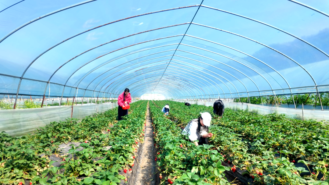 走进天雄村的草莓种植基地,一排排草莓大棚整齐排列。大棚内,鲜红饱满的草莓掩映在绿叶间,清甜的果香扑面而来、沁人心脾。游客们手提果篮,穿梭在田垄之间,仔细挑选着心仪的草莓,欢声笑语间,洋溢着春日里的惬意与美好。