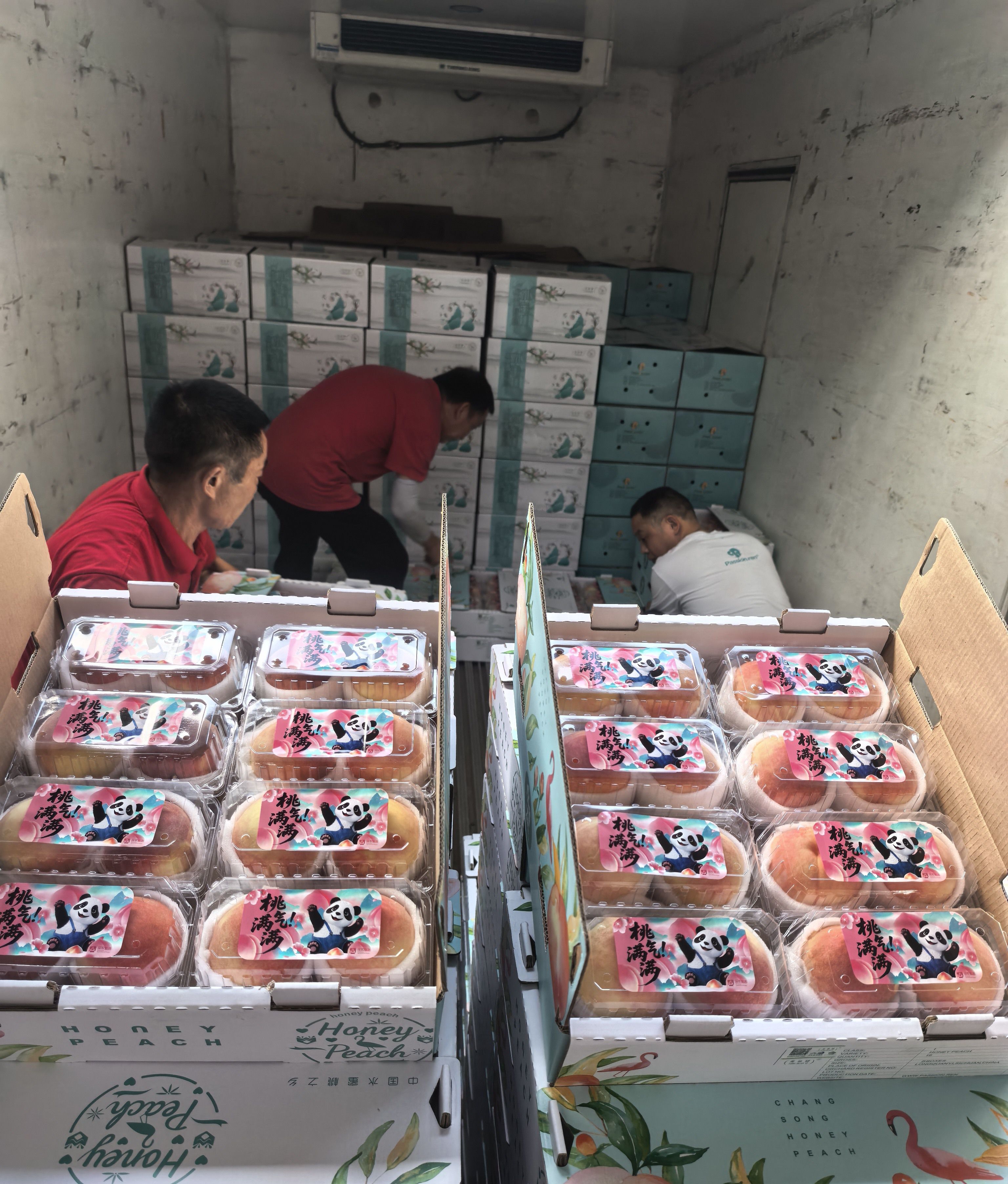龙泉驿水蜜桃素有“天下第一桃”美誉,但鲜果保鲜期短、翻运损耗大一直是外销难题。作为深耕龙泉驿水蜜桃销售的本土企业四川盘信农业有限责任公司,积极打开水蜜桃销路,利用深农集团“全国一张网”农产品高效流通网络及供港快速通关优势,与海吉星·成都密切合作,通过“基地直采+整车专线”模式,整合产地分级、预冷保鲜、全程温控等环节,将传统5天的运输周期压缩至2天,每颗桃子经过糖度检测和抗震包装,到港时完好率超98%,确保了龙泉驿水蜜桃以最佳状态亮相香港市场。