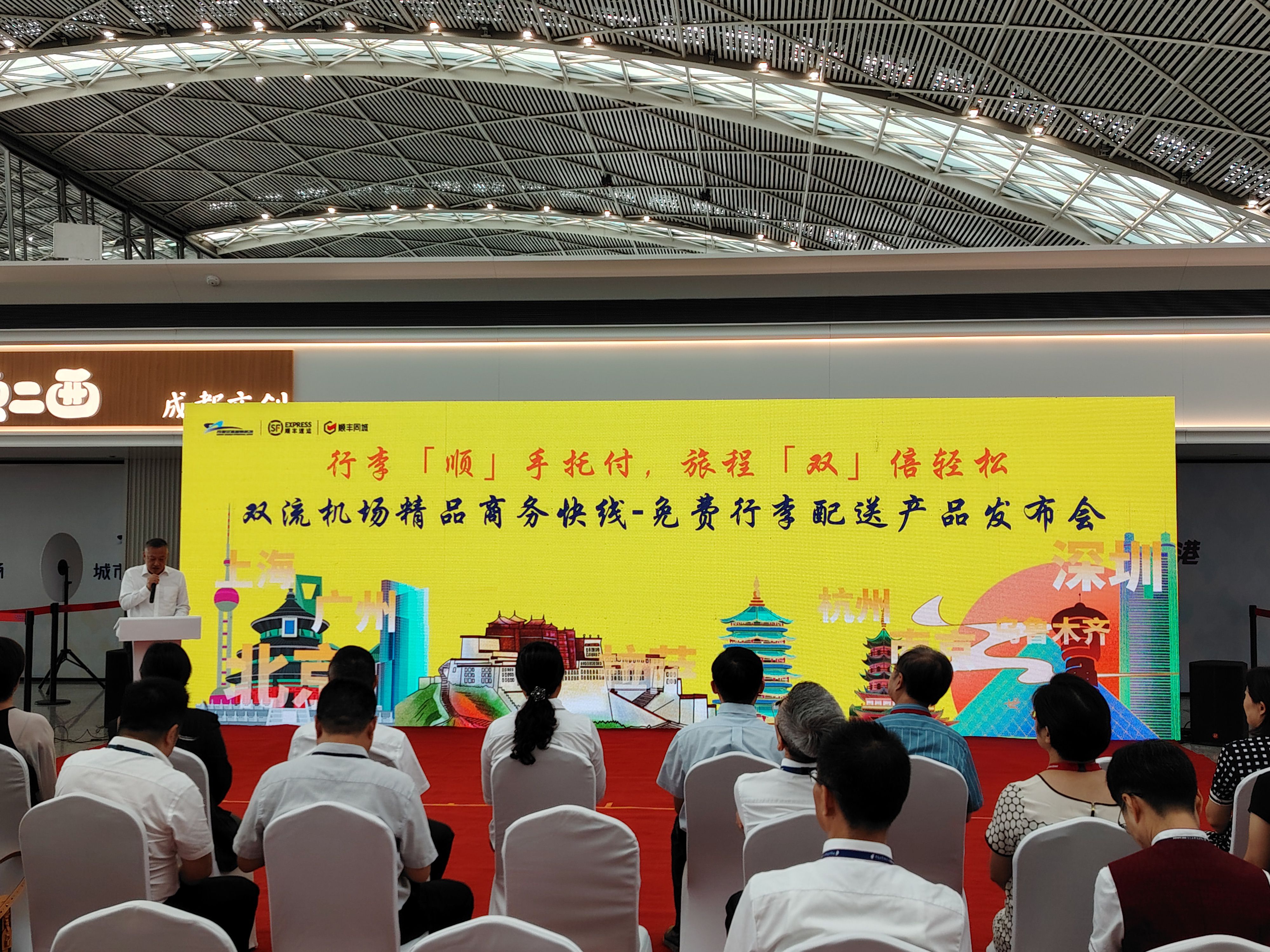 8月21日上午,双流国际机场联合顺丰速运正式对外发布了“精品商务快线免费行李配送”服务产品。乘坐“北上广深乌拉杭宁”精品商务快线抵离成都的旅客都可以申请享受首件行李免费配送到家、到酒店或到机场的服务。