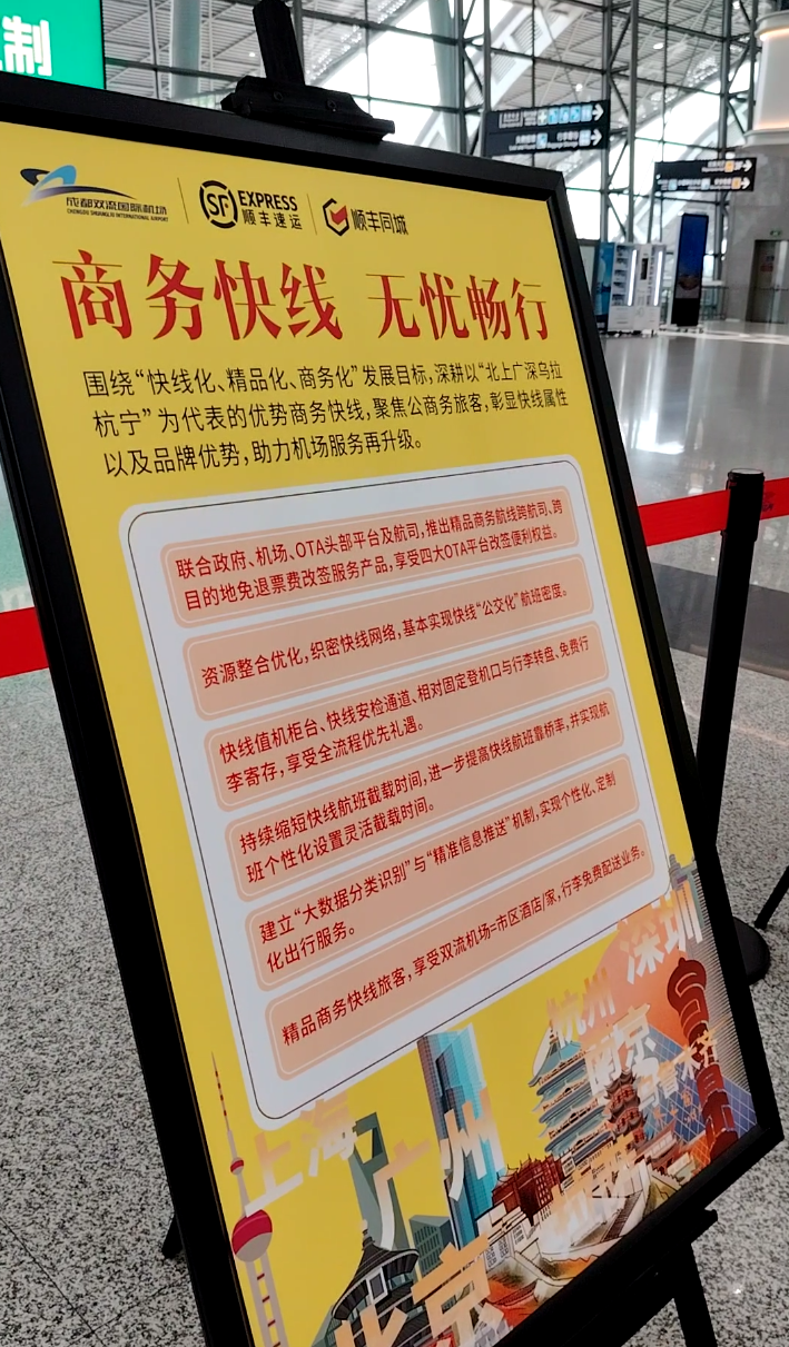 吴先生的体验并非个例。自7月1日起,双流国际机场联合顺丰速运,面向乘坐“北上广深乌拉杭宁”精品商务快线的旅客,试点推出“成都市八大区域(青羊区、金牛区、成华区、锦江区、武侯区、高新区、温江区、双流区)往返双流机场”“门到港、港到门”全链条免费行李配送服务,此举在全国机场中属于“首创”。