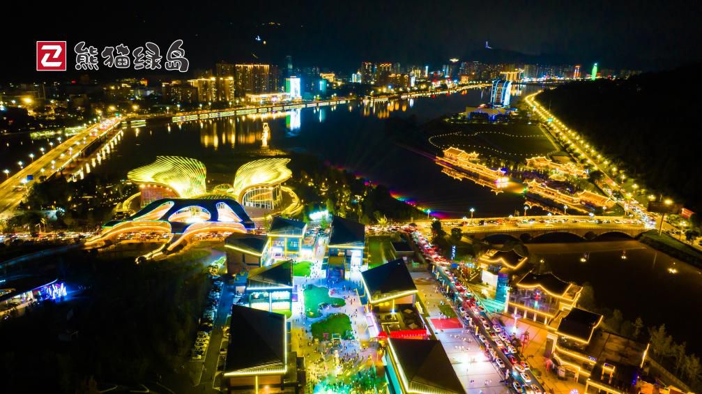 夜幕降临,熊猫绿岛特色文旅消费街区灯火通明。