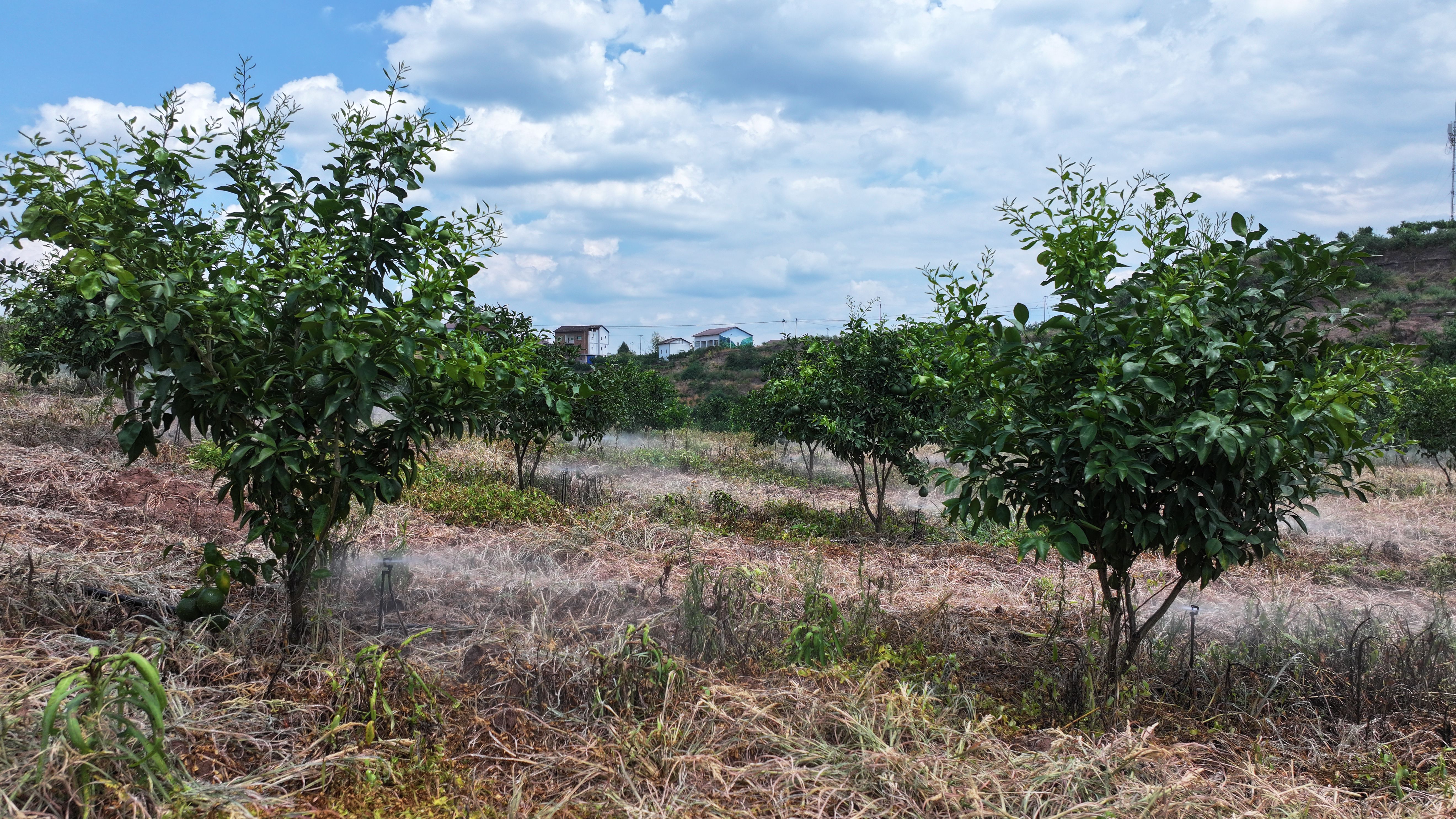 百亩高标准柑橘示范园自动喷灌现场。