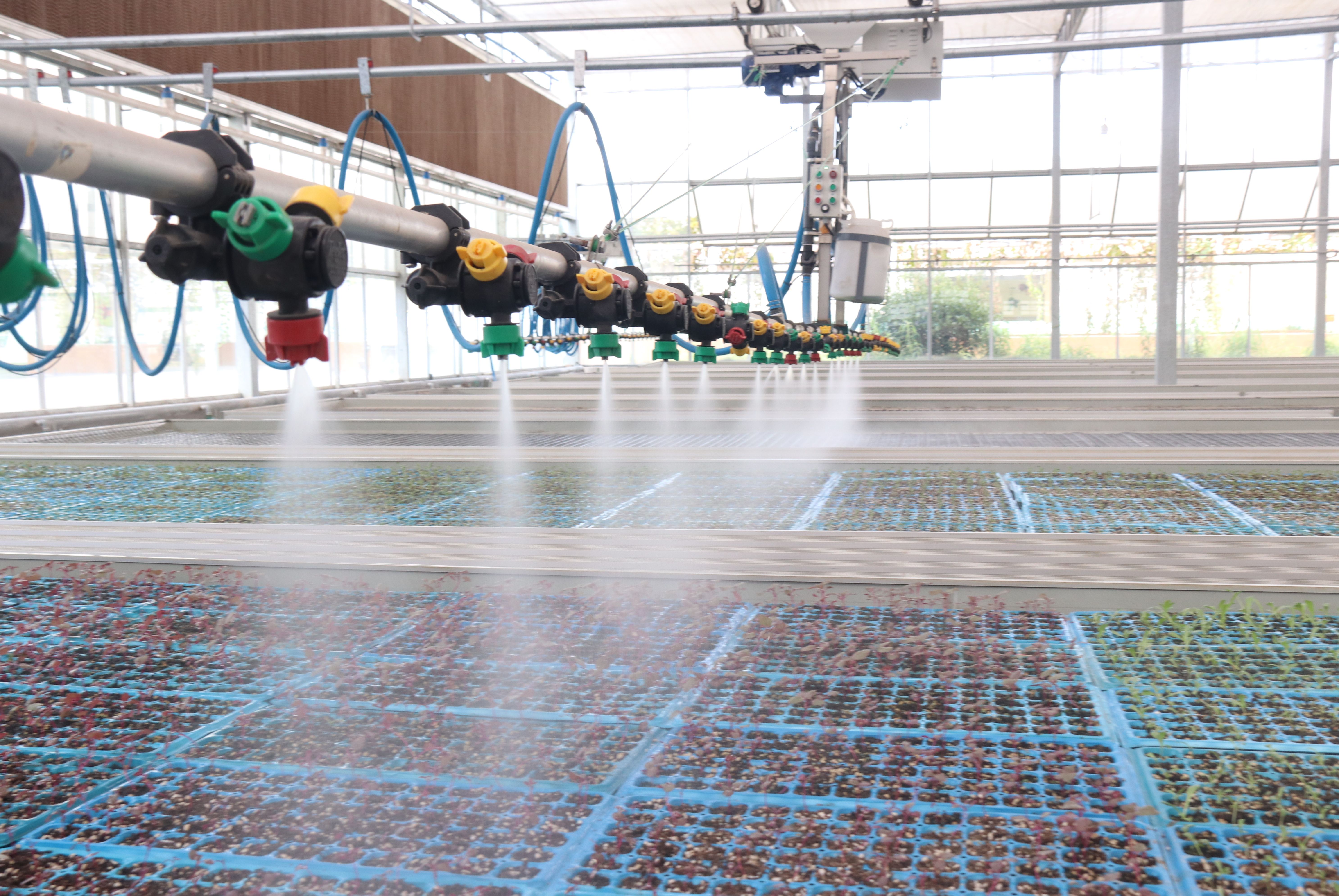 天志种植专业合作社育苗大棚自动喷灌设备。