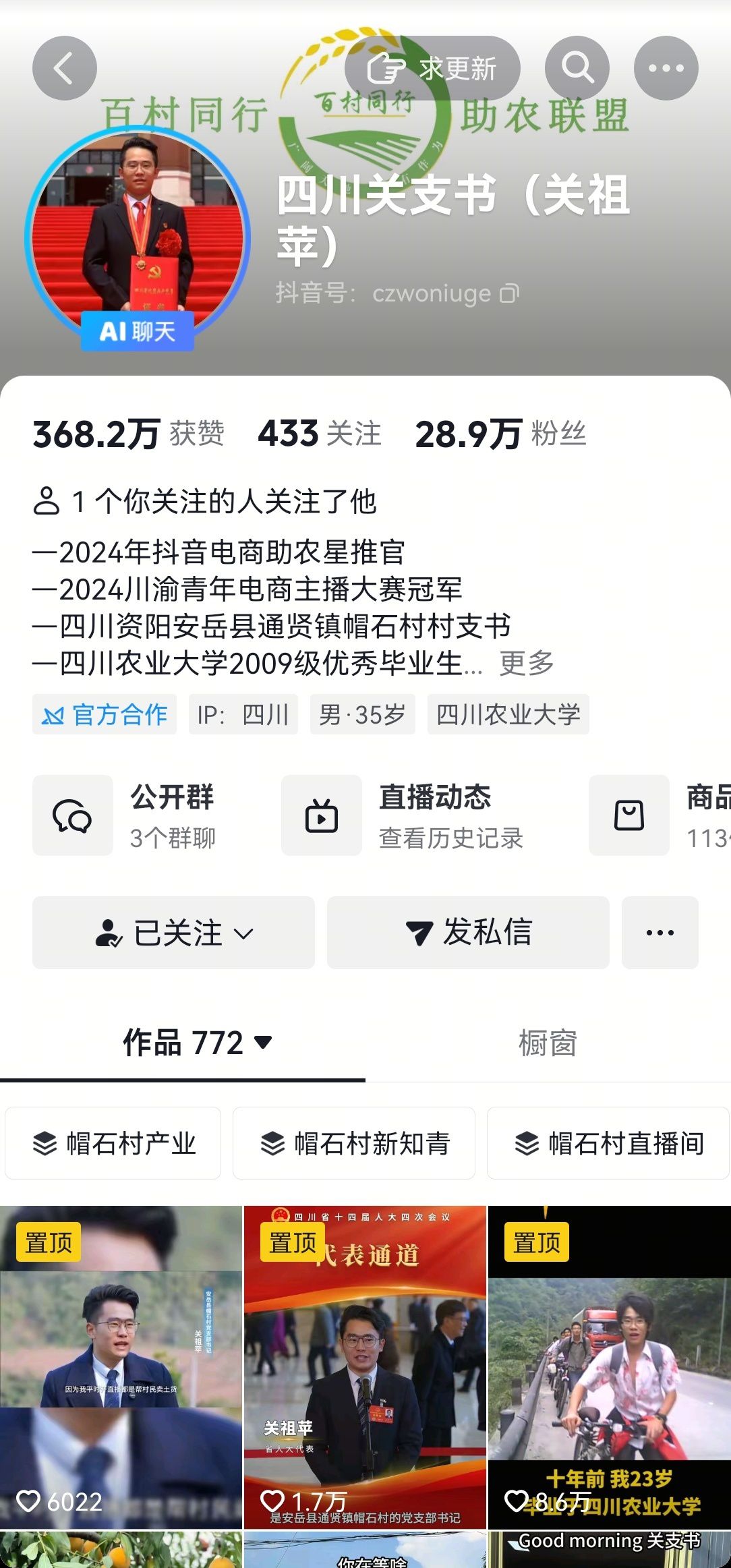 在四川,像关祖苹这样充满网感的村支书还有不少,他们有的对着镜头高歌,有的讲述工作故事,有的拿着农副产品在地里带货直播……其中,不乏粉丝数十万的“网红”,网友们感叹“继文旅局长之后,村支书们又开始卷起来了”。