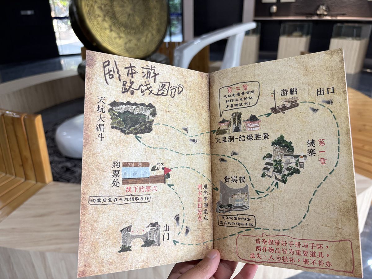 “一天逛不完了!”不少游客感叹。这也是兴文石海景区僰影寻踪剧本游项目负责人陈柯妍参与设计这套情景设计的初衷。让游客有更好的沉浸式体验感受,从台词可窥一二——目前景区内台词最多的演员有3万句台词,这意味着面对大多数游客提问,演员都能引导到核心剧情当中。