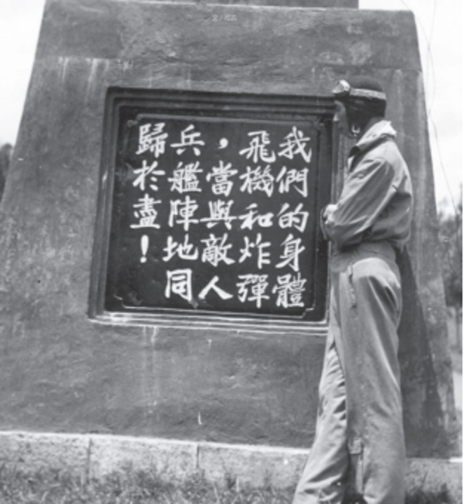 图为航校学员与刻有中央航校校训的石碑合影(王国平 供图)