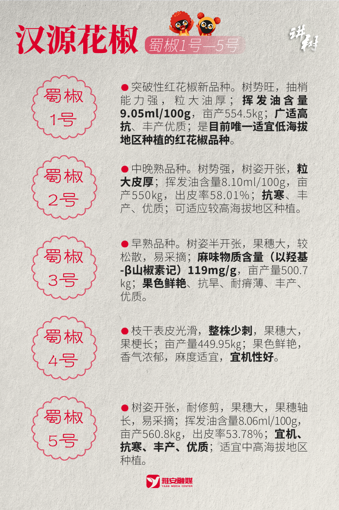 “在适应性、产量、品质、抗性、宜机性等品质方面表现突出,均已获得由国家林草局颁发的植物新品种权。”四川省特色植物研究院党委副书记、四川花椒创新团队首席专家曾攀介绍。