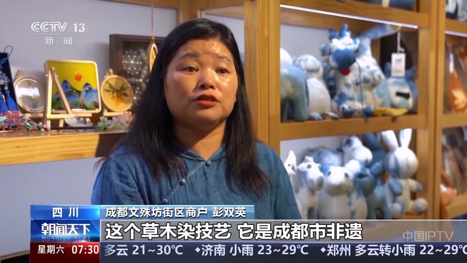 四川成都文殊坊街区商户 彭双英 :这个草木染技艺,它是成都市非遗,这个非遗引来了很多全国各地的朋友。比如说国外的很多(游客)他们也想来感受一下。