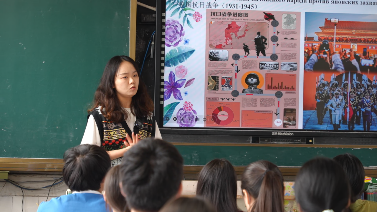 课堂上,刘雪老师首先借助历史影像资料,向学生介绍了中国和苏联在世界反法西斯战争中作出的巨大贡献,并着重讲解了两国人民在抗战岁月中的动人故事。