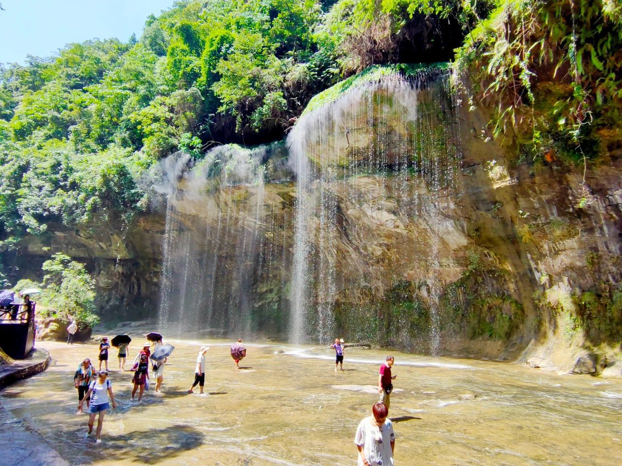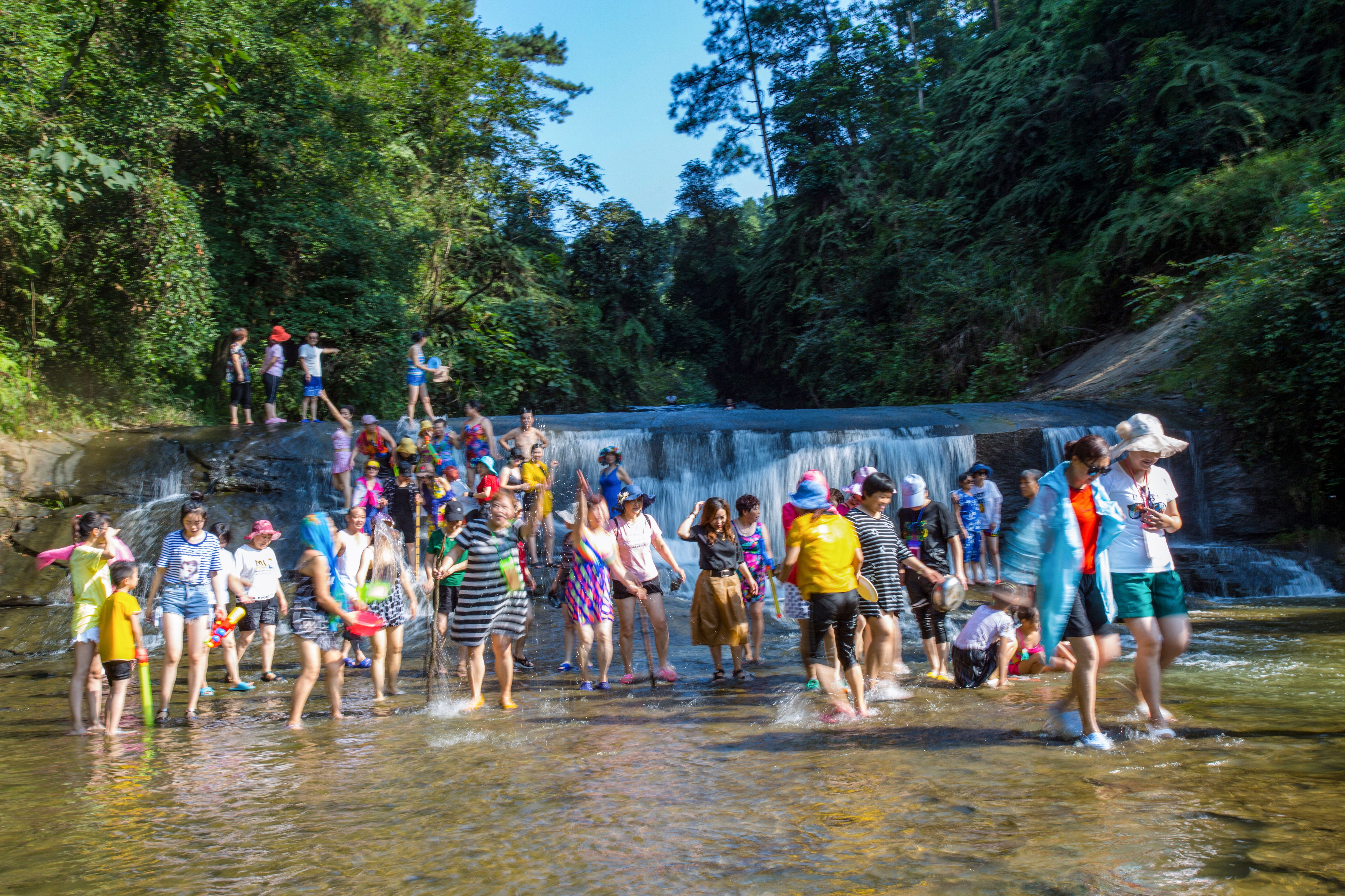 石板河河床呈“U”字形,由整块平坦岩石构成,全长约7公里,有“中国最长石板河”的美誉;水温常年保持在20℃左右,平均水深仅50厘米,再搭配5到8度的河床坡度,完美造就了“人可步行、童可戏水”的风景线:换上溯溪鞋,踩着亿年冲刷的光滑石板,任清凉的水流漫过脚踝,拎一只网兜,从石块间翻找小鱼虾总有惊喜,或者抄起水枪、水盆“野”着玩也行,燥热与烦恼都会瞬间退散。在刚过去的暑期旺季,这里凭借避暑游走俏,累计接待约10万名游客,直接拉动近600万的经济收益。