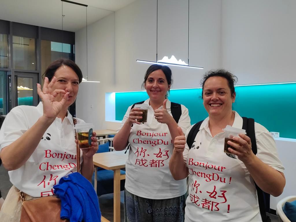 7月13日,在品尝中药茶饮后,三名法国中医药爱好者表示非常满意。新华社记者 董小红 摄
